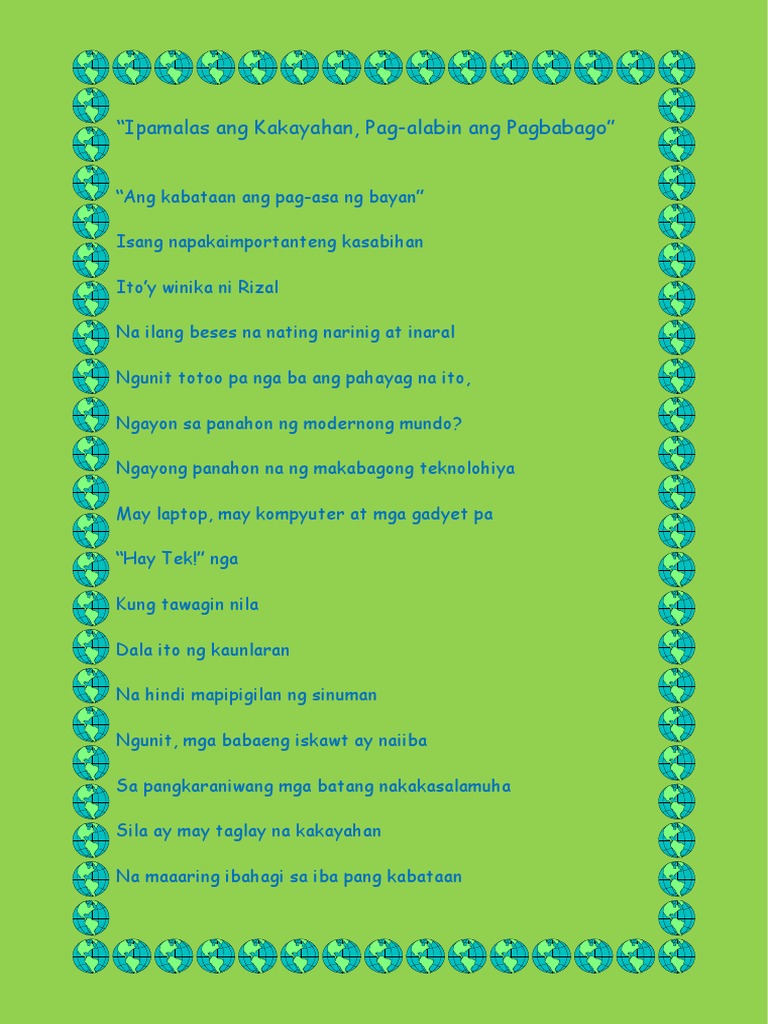 Kabataan sa makabagong panahon apoken poetry. Spoken poetry tungkol sa buhay ng kabataan. Dalawang libot dalawampu Taon sa kasalukuyan Sakit na hindi inaasahan Gumimbal sa ating bayang sinalangan Bilang isang magaaral ikaw ako lahat naman tayo nagangarap Makapasok. Kabataan pag-asa pa nga ba ng bayan.