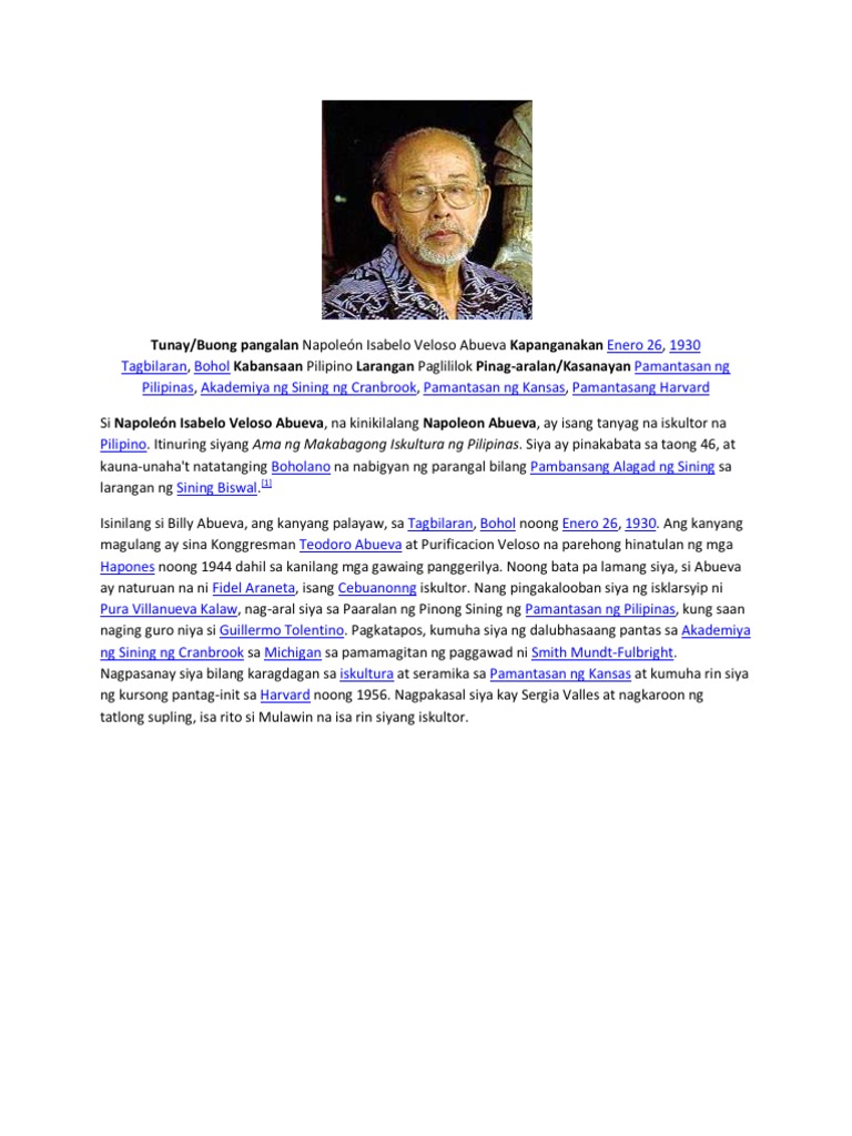 Ama ng Makabagong Eskultura October 2 2019 by Bigwas Itinanghal na Pambansang Alagad ng Sining para sa Eskultura noong 1976 si Napoleon V. Mapapansin sa kasaysayan ng mga namuno sa buong Pilipinas makikita natin ang mag- asawa magkakapatid mag-ama at marami pang iba ang nanahan sa pulitikal na. Scribd adalah situs bacaan dan penerbitan sosial terbesar di dunia.
