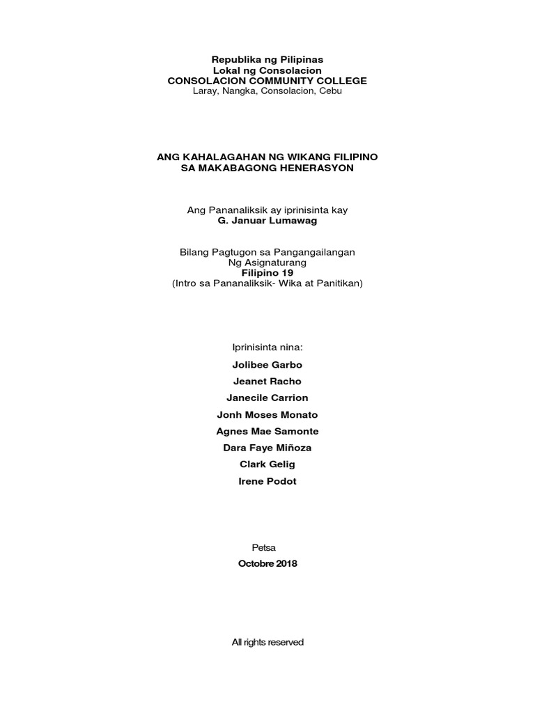 Ang Kahalagahan Ng Wikang Filipino Sa Makabagong Henerasyon Pdf